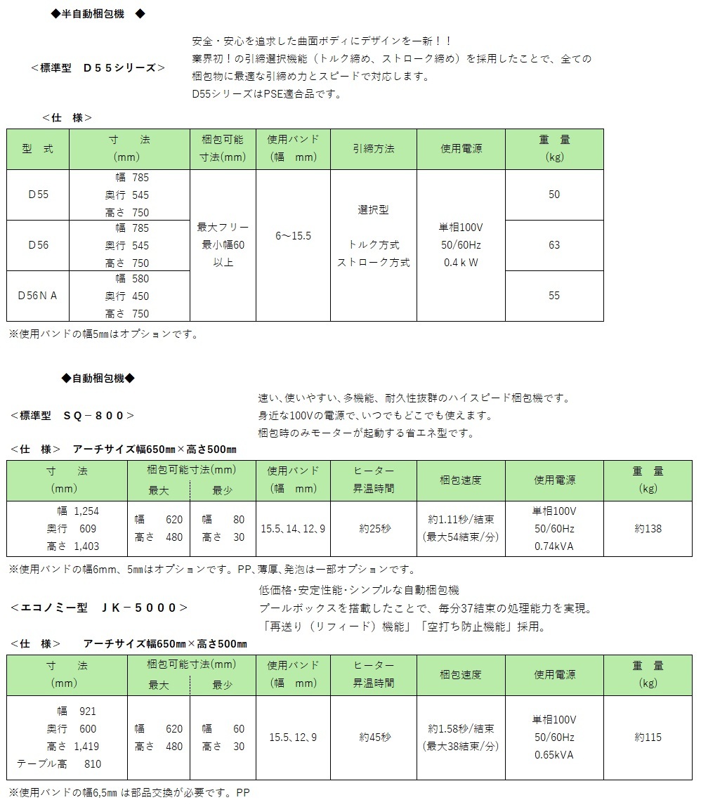 梱包機 *半自動梱包機 = 小型で省電力、幅広い場所でも導入できる半自動梱包機。 高性能と多品種、豊富な品揃えで、オフィス、作業場のニーズにお応えいたします。 *全自動梱包機 = 梱包作業の効率化を図るなら、自動梱包機をおすすめいたします。 大量の荷物を梱包する作業場や、集中的に荷作りを行う現場に効率化をもたらします。