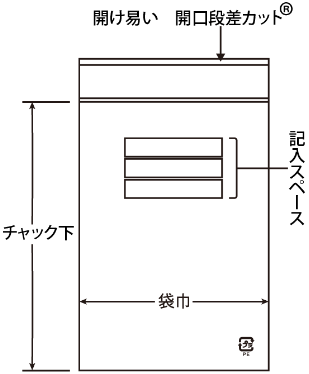 < 基材構成:PE単層40μ > < 仕様:サイド 溶断シール、天開き、底折り返し、開口段差カット、1C印刷 > |