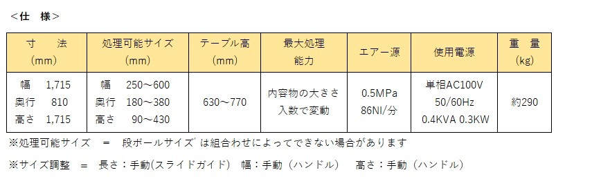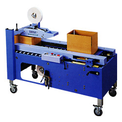 製函・封緘機 ワークメイト011台で「組み立て」「箱詰め」「封緘」がラクにこなせる半自動製函封緘機。 ケース吸着保持機構付きでケースを開いて差し込むだけで底部を自動折込。 サイズ調整は巾・高さ・長さの3ヶ所の簡単操作で手軽に移動可能なキャスター付きです。 従来のミニライン(半自動製函機+封緘機)では若干能カの足りない現場や 小型中型サイズの段ボールに最適です。