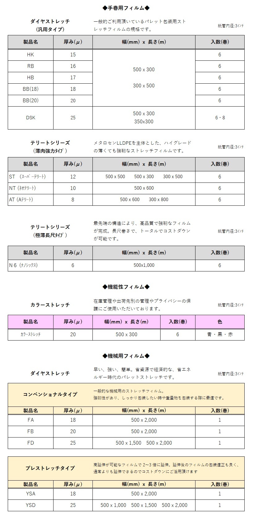 搬送する際の梱包物の型崩れや荷崩れを防止できます。 フィルムを巻くことによりどんな梱包物の形でも簡単に梱包することができ、防水や防塵、汚れを防ぐなどの効果があります。 フィルムは手巻き用のもののほか、専用のストレッチフィルムホルダーなどを使って効率的に巻く道具もあります。 配管や結束の用途に使用する小幅タイプや、機械用の専用ストレッチフィルムもあります。